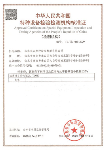 山東光大特種設(shè)備檢測有限公司是經(jīng)山東省市場監(jiān)督管理局核準(zhǔn)的甲類B1特種設(shè)備綜合檢驗(yàn)機(jī)構(gòu)。2017年9月30日取得了山東省市場監(jiān)督管理局頒發(fā)的《檢驗(yàn)檢測機(jī)構(gòu)資質(zhì)認(rèn)定證書》。2018年2月22日取得了山東省市場監(jiān)督管理局頒發(fā)的《特種設(shè)備檢驗(yàn)檢測機(jī)構(gòu)核準(zhǔn)證》(起重機(jī)械)檢驗(yàn)檢測資質(zhì)。2021年11月取得山東省市場監(jiān)督管理局版發(fā)的《特種設(shè)備檢驗(yàn)檢測機(jī)構(gòu)核準(zhǔn)證》(安全閥在線、離線)校驗(yàn)資質(zhì)。2023年11月取得山東省市場監(jiān)督管理局頒發(fā)的甲類檢驗(yàn)機(jī)構(gòu)B1《特種設(shè)備檢驗(yàn)檢測機(jī)構(gòu)核準(zhǔn)證》,具有壓力容器(RD2...